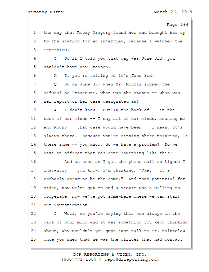 4:39 AM: Lt. Tim Muzny takes over the case from the on-call detective. He “instantly” assumes Ligons’ complaint is connected to the unrelated Terri Morris complaint from several weeks earlier–a complaint that had been viewed with derision by Muzny’s superiors.
