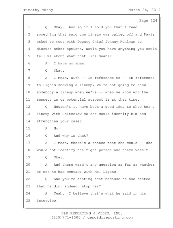 • The “We Already Knew” Excuse. Lt. Muzny argued a lineup was unnecessary because investigators already knew Holtzclaw was the suspect from his statement (“that’s what he said in his interview”). This is chronologically impossible: the discussion about the line-up occurred during the morning of June 18; Daniel’s interview took place in the afternoon. Investigators obviously discussed the lineup before interviewing Daniel.