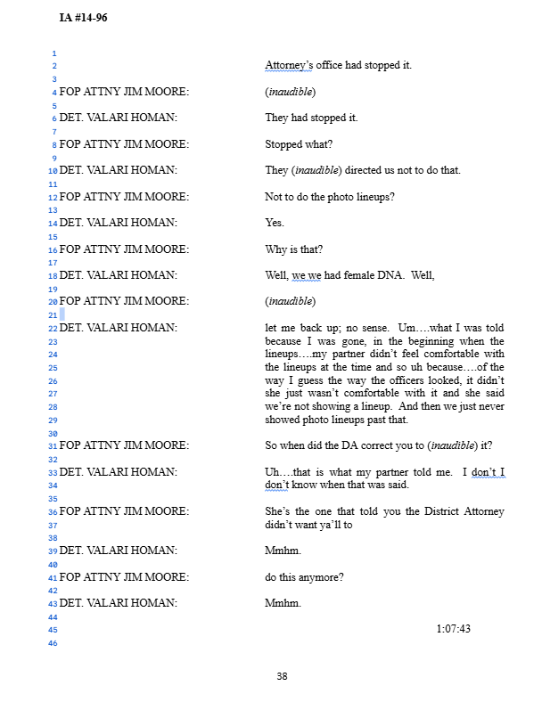 • The “Aesthetics” Excuse. Lt. Muzny claimed the lineup was canceled because the lead investigator didn’t like “the way the officers looked” in the photos. What does this even mean?